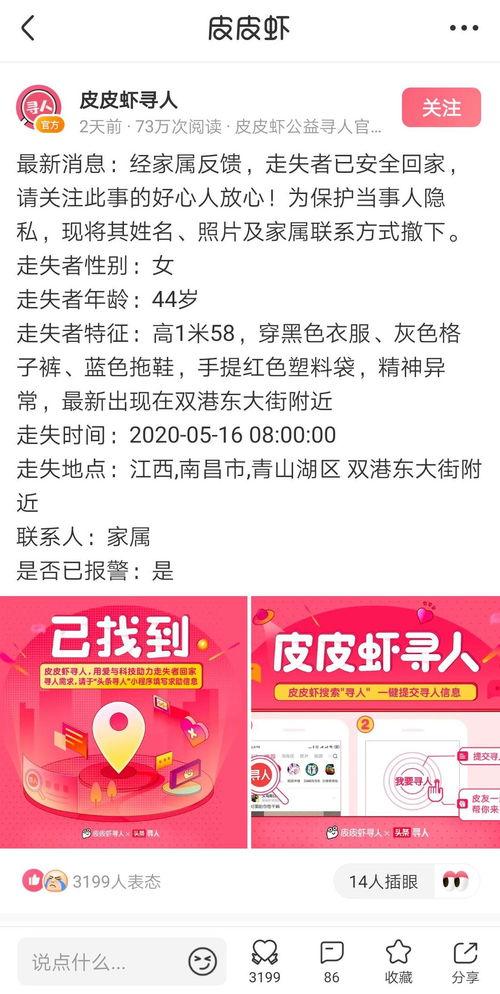 在这个信息爆炸的时代,网络已经成为人们生活中不可或缺的一部分。而“头条寻人南昌网”就是这样一个充满正能量的平台。它依托于互联网的强大力量,为那些走失的孩子们、迷失的老人以及失散的家庭搭建起一座沟通的桥梁。
